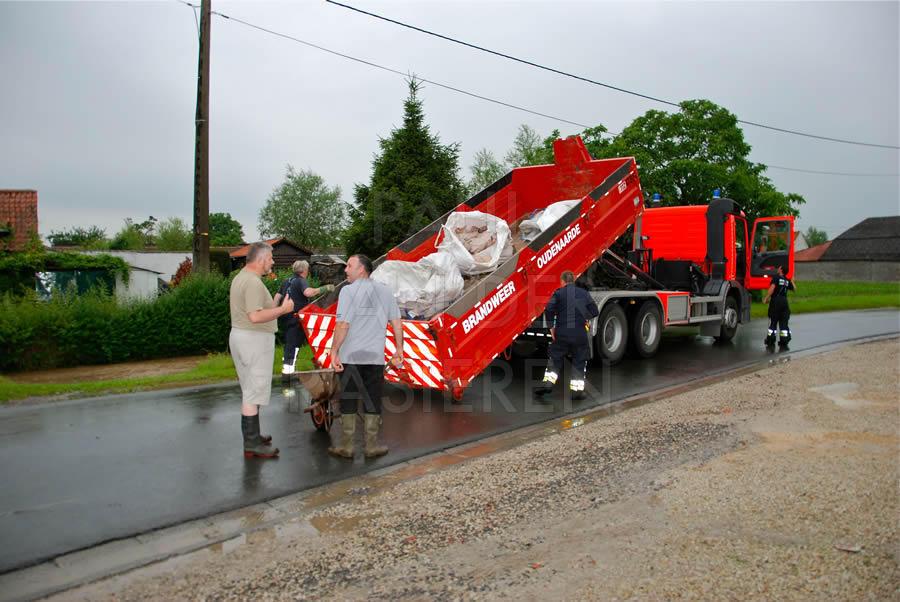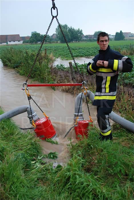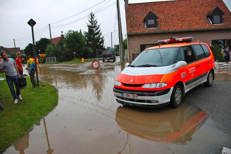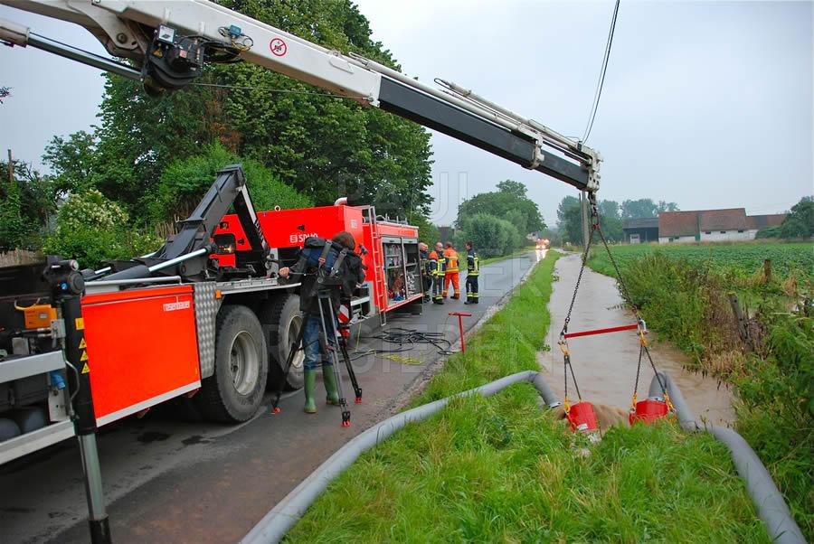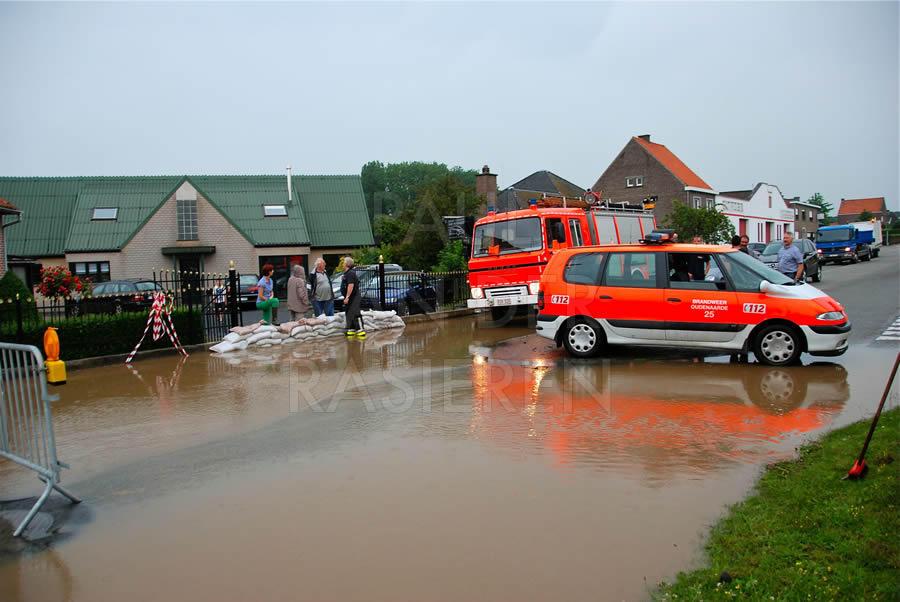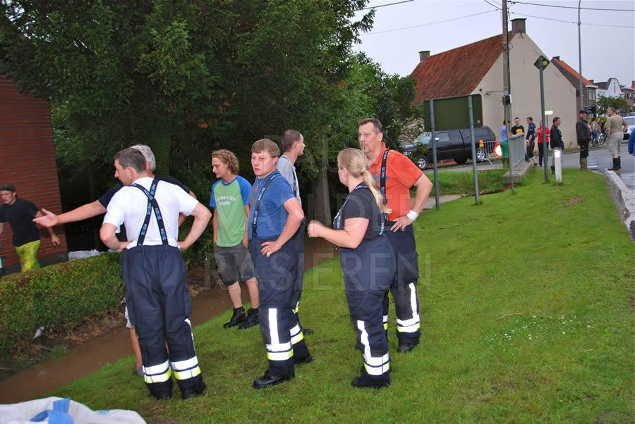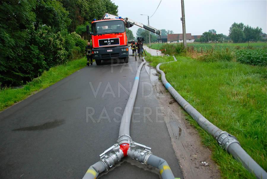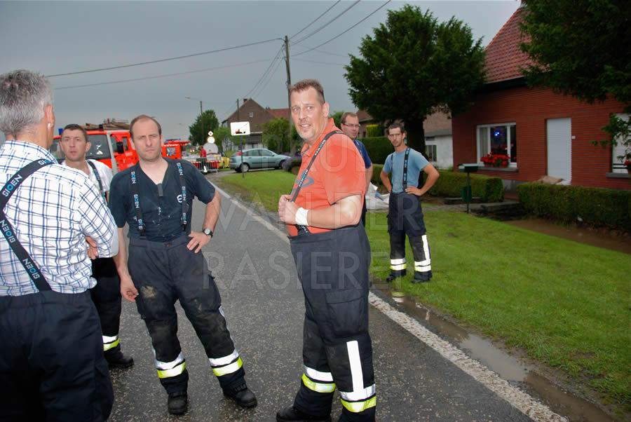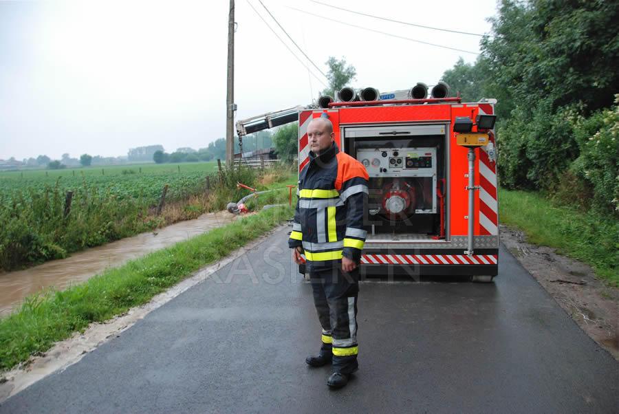 Op 5 juli zorgden hevige regenbuien mermaals voor wateroverlast op diverse plaatsen. Dankzij de ervaring van de korpsen en het nieuwe materiaal waarin de afgelopen jaren werd geïnvesteerd, konden ergere rampen voorkomen worden. Hier ziet u enkele beelden uit de Boeregemstraat in Zingem, net aan de grens met Kruishoutem. Zowel de korpsen van Oudenaarde als van Kruishoutem kwamen terplaatse met man en mocht om zo snel mogelijk de woningen te vrijwaren. Met zware pompen werden overvolle beken ontlast naar andere waterlopen. De nieuwe container met zware pompen en slangen bewees zeker zijn nut.