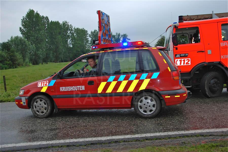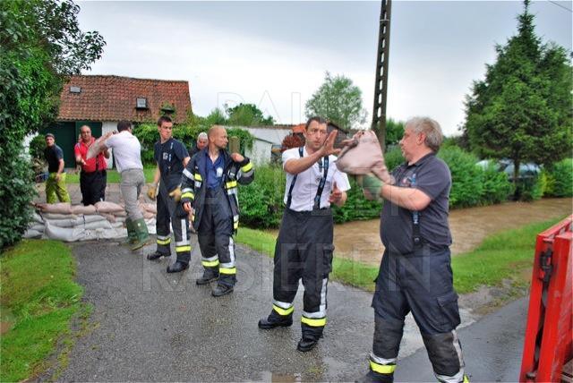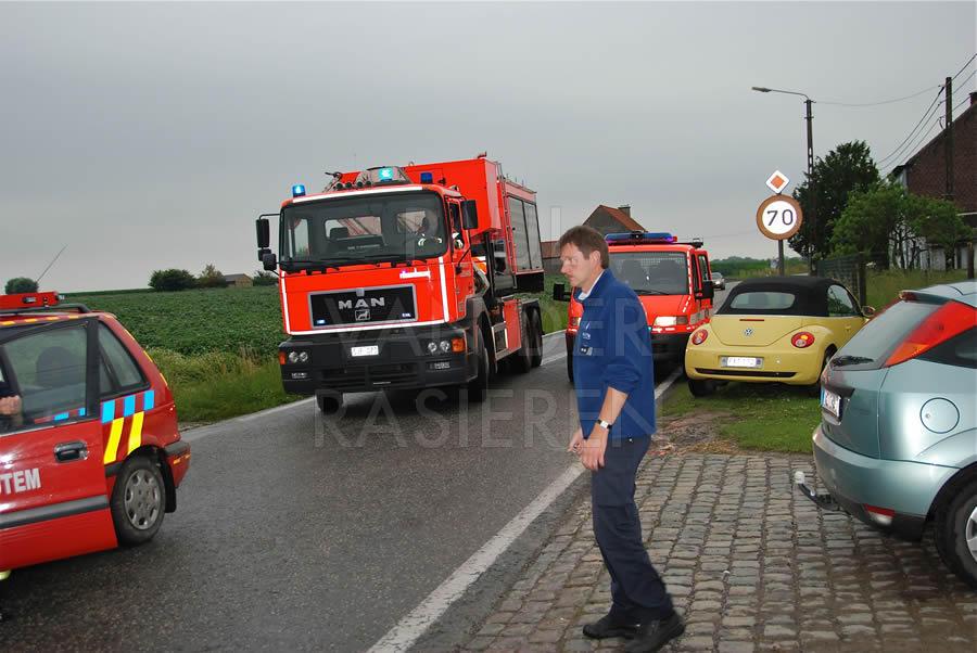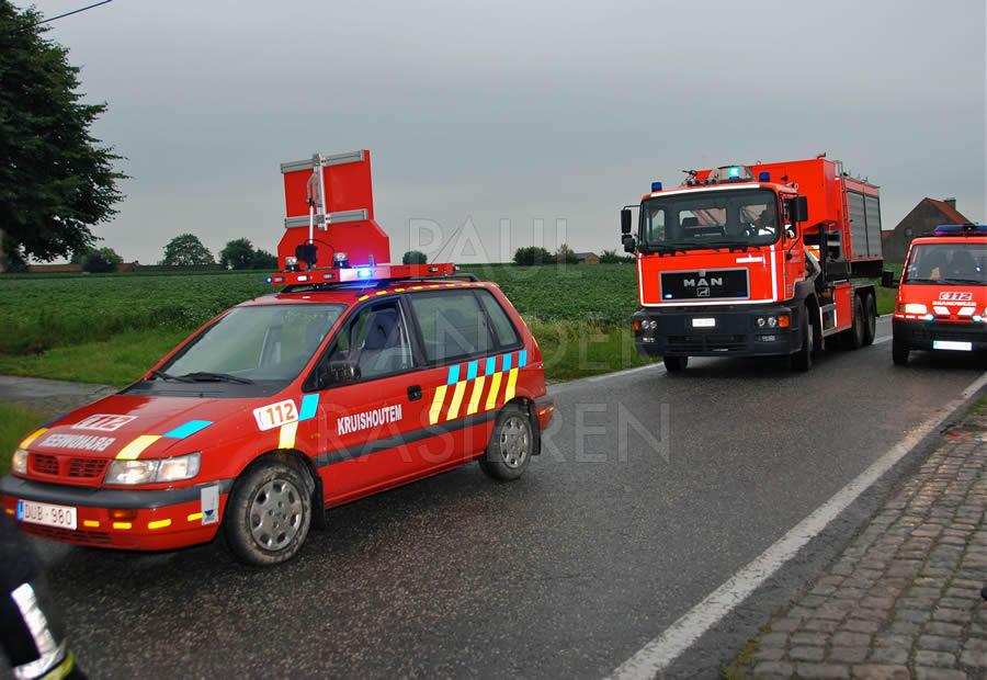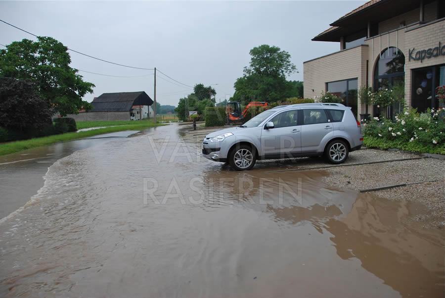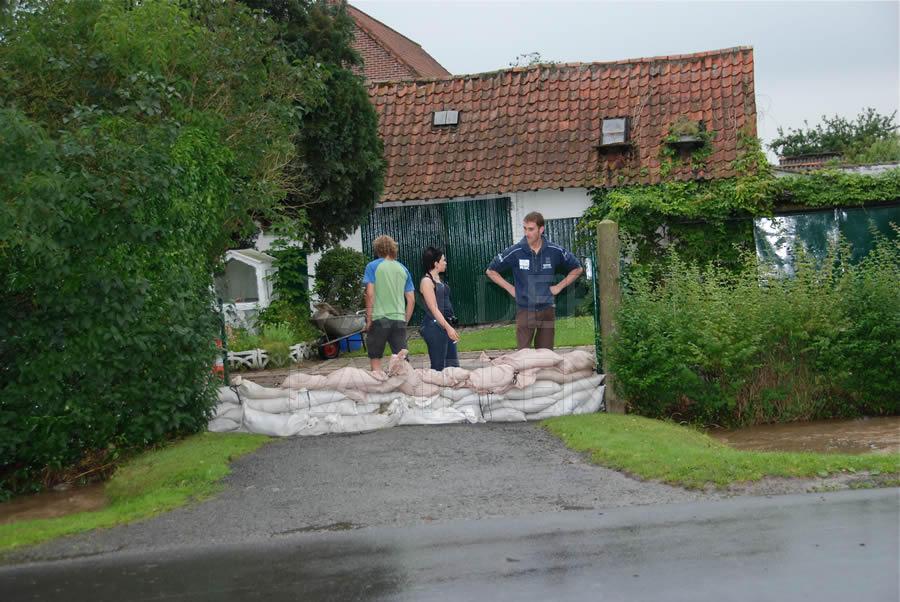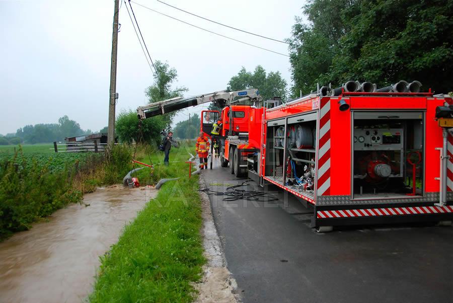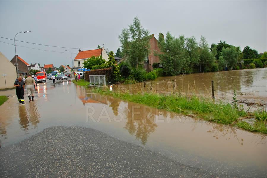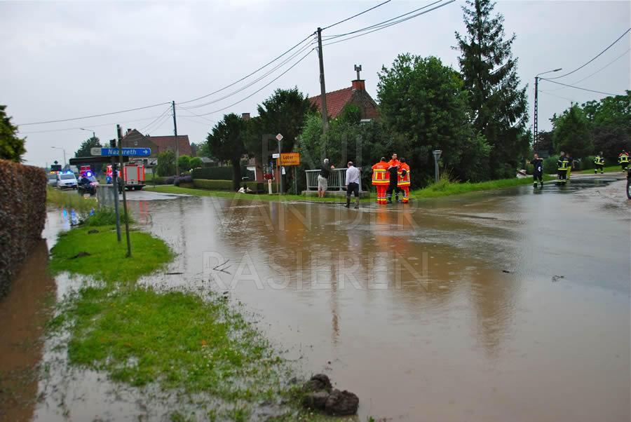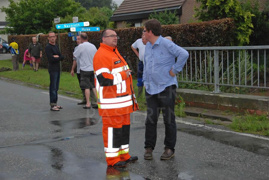 Op 5 juli zorgden hevige regenbuien mermaals voor wateroverlast op diverse plaatsen. Dankzij de ervaring van de korpsen en het nieuwe materiaal waarin de afgelopen jaren werd geïnvesteerd, konden ergere rampen voorkomen worden. Hier ziet u enkele beelden uit de Boeregemstraat in Zingem, net aan de grens met Kruishoutem. Zowel de korpsen van Oudenaarde als van Kruishoutem kwamen terplaatse met man en mocht om zo snel mogelijk de woningen te vrijwaren. Met zware pompen werden overvolle beken ontlast naar andere waterlopen. De nieuwe container met zware pompen en slangen bewees zeker zijn nut.